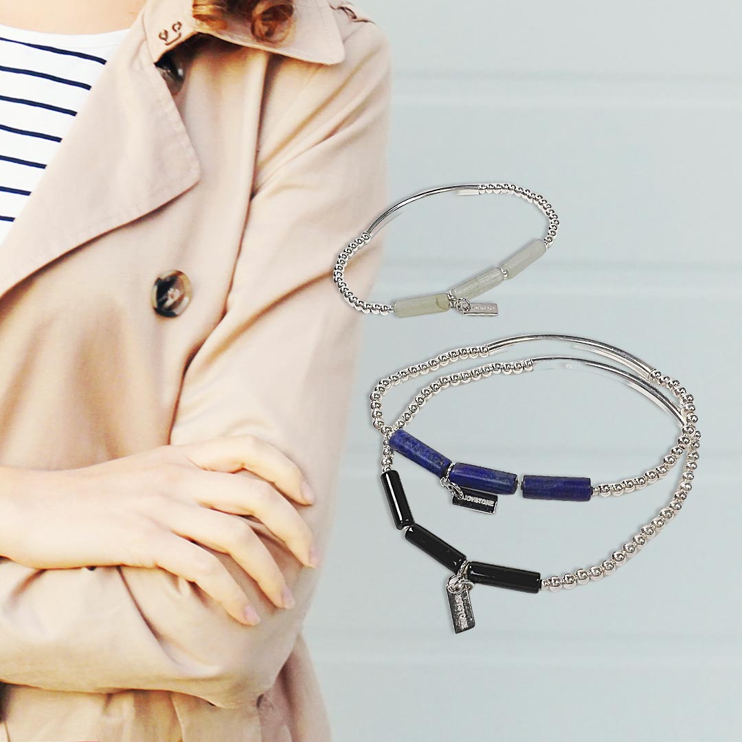 鬆弛感的925銀珠x銀管x天然石管珠,管珠主石4選1:紫水晶、青金石、黑瑪瑙、金膽石搭配925銀珠與銀管的設計,帶出手腕柔和的線條,單獨或累加配戴,舉手投足展現纖細、輕柔。彈性款手串以以珠寶專用彈性蠶絲線製作,穿戴方便,鍊寬約4mm,一般手圍約15-17cm可配戴。